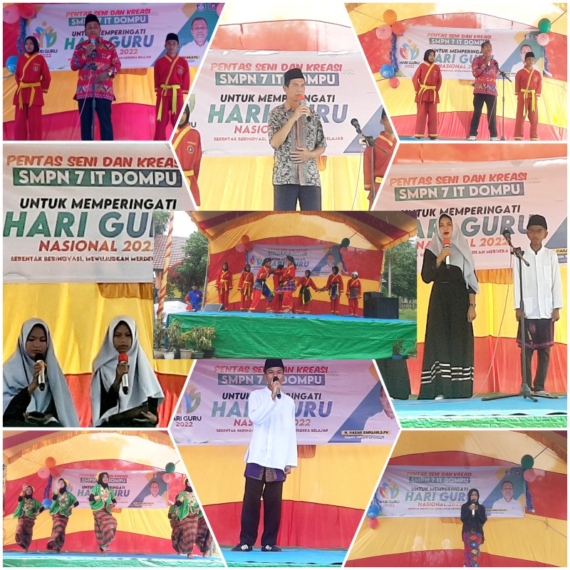 Selain mengadakan lomba Sabtu, 26 Desember 2022 SMPN 7 IT Dompu mengadakan pentas seni dan kreasi di halaman sekolah untuk merayakan hari guru. Acara tersebut dihadiri oleh Bapak Kadis Dikpora Kab Dompu, Kapolsek Dompu, Danramil Kota, Lurah Kandai Satu, Kepala SDN lingkup zona SMPN 7 IT Dompu, Ketua Komite, serta beberapa tokoh masyarakat sekitar dan wali murid.
