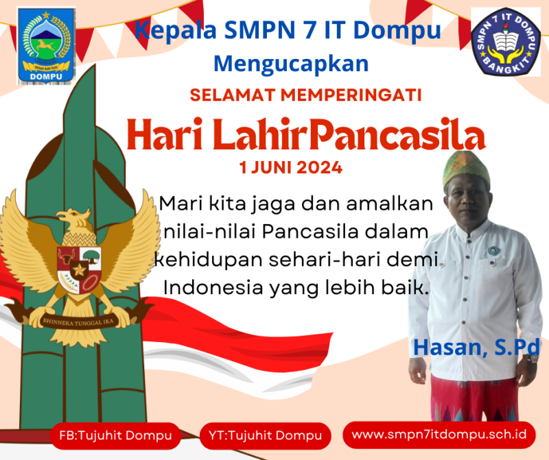 Kepala SMPN 7 IT Dompu mengucapkan Selamat Hari Kesaktian Pancasila, 1 Juni 2024.