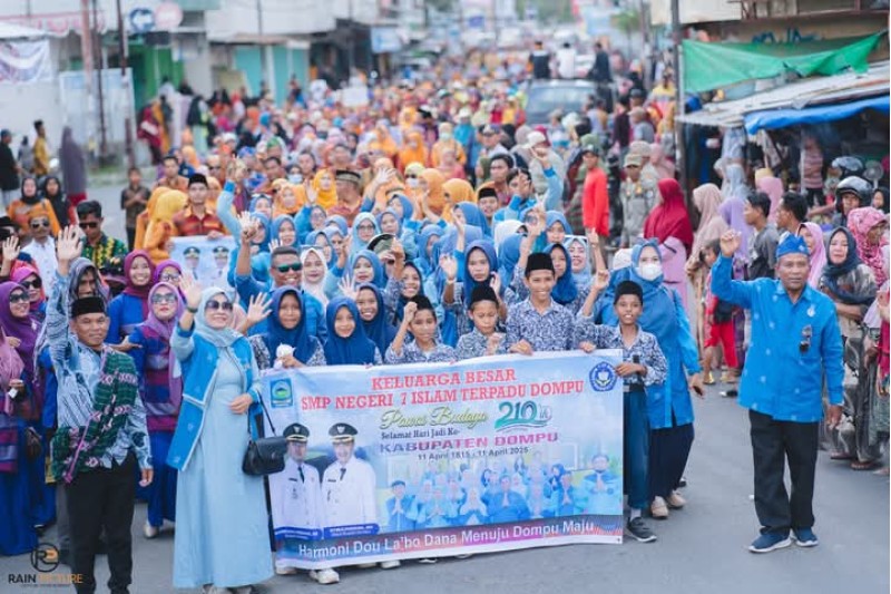 Dengan memakai Muna Pa'a berwarna biru Kepala Sekolah dan Guru serta Pengawai SMP Negeri 7 IT Dompu kompak dan mengikuti pawai sampai finish. Di umur yang 210 tahun ini semoga Dompu terus berinovasi dan berbenah, menjadi kota global yang nyaman dan ramah bagi semua. Mari kita terus menjaga dan melestarikan nilai-nilai budaya dan alam, serta membangun kemajuan menuju masa depan yang gemilang. Nggahi Rawi Pahu.(Iin-Dz)